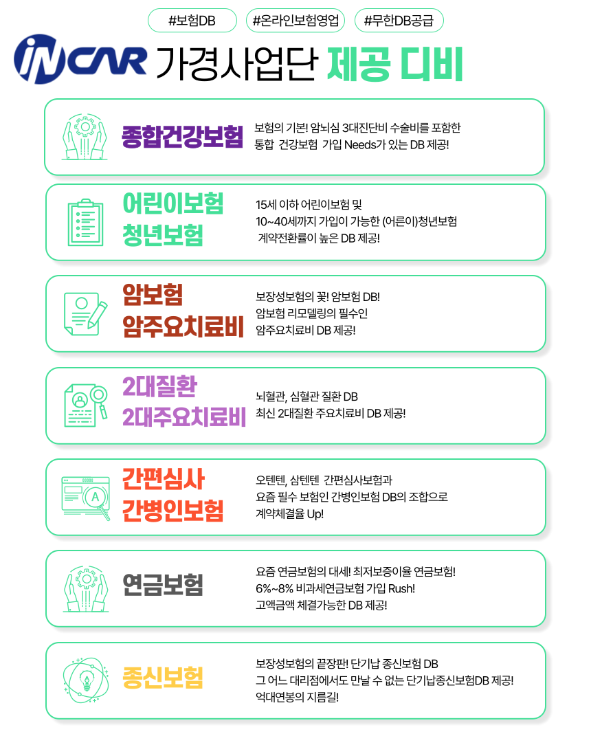 ※ 건강보험, 어린이보험, 암보험+암주요치료비, 2대질병+순환계질환주요치료비, 간편심사, (어른이)청년보험등 다양한 디비제공